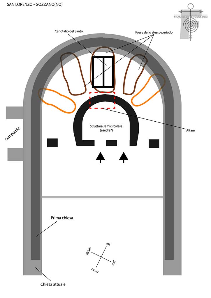 Quando poi la prima chiesa fu costruita al di sopra di questo insieme, l’abside fu impostata in modo da inglobare le tombe, ma erano già così antiche che, non essendone visibili le parti terminali, l’emiciclo finì sovrapposto ai piedi degli occupanti di quelle laterali.