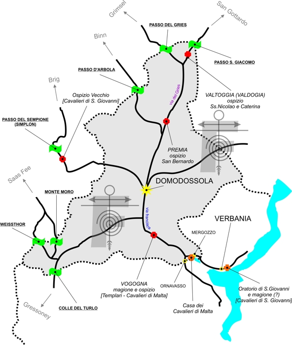 In quasi tutte le pubblicazioni sulla presenza dell’ordine templare in Italia mancano riferimenti sulla parte più settentrionale del Piemonte e in particolare sull’area compresa tra il Lago Maggiore e la Svizzera attuale. Eppure l’importanza storica delle vie di transito e dei passi della Val d’Ossola farebbe supporre che gli ordini gerosolimitani sorti durante le crociate non potessero aver trascurato questa regione. In essa si snoda infatti una parte nevralgica dell’antica Via Mala, che connetteva la Pianura Padana e le leghe cittadine lombarde produttrici di vino, sale e grano con le grandi fiere della Champagne e il Centro Europa, da cui provenivano pelli e latticini.