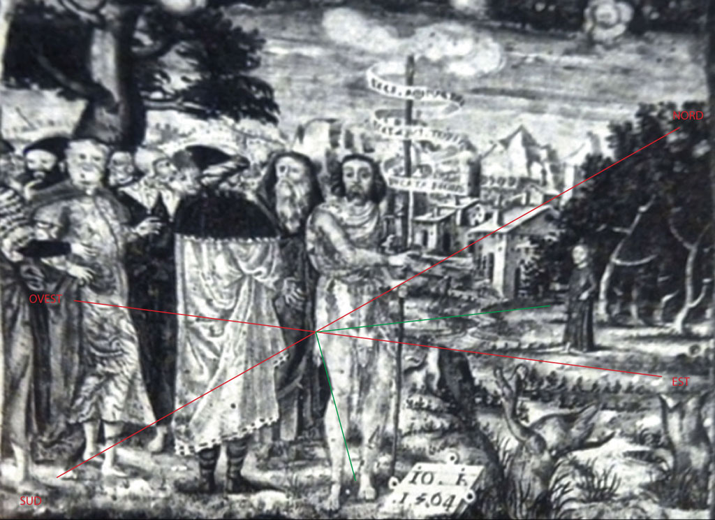 Non รจ, non puรฒ esserlo, casuale neppure la collocazione dei personaggi nell’ambientazione. Le ombre corte raccontano che รจ una giornata di sole, verso l’ora di mezzogiorno, l’ora del โsol invictusโ che si eleva al di sopra di tutto. Trovato il sud, si trova il nord, l’est, l’ovest. Gesรน โprovieneโ da Nord est, Giovanni si trova a sud est. Sono le posizioni in cui sorge il sole ai solstizi. Eresia! Paganesimo! Non รจ forse l’Est, l’Equinozio, o a volte il Nord, l’unica direzione astronomica ammessa dalla cristianitร ?