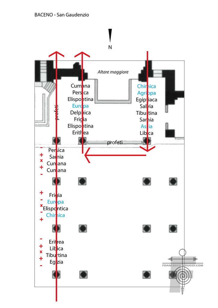 In tal modo era nata a Baceno una nuova teoria di 12 sibille negli intradossi del secondo, terzo e quarto arco laterale della navata occidentale, che andavano ad aggiungersi alle altre 16 già esistenti. Per quantità corrispondevano all’elenco canonico proposto da Filippo Barbieri (anche i vaticini riportati nella fasce di tutte le sibille in San Gaudenzio provengono dal Discordantiae). A ben guardare, però, la successione non è quella offerta dall’inquisitore domenicano.