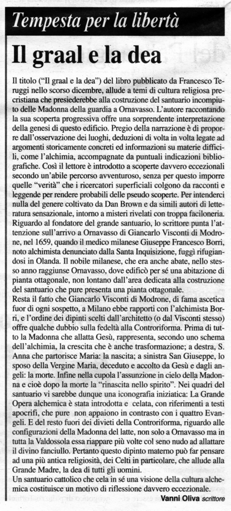 II titolo, II Graal e La Dea, del libro pubblicato da Francesco Teruggi nello scorso dicembre, allude a temi di cultura religiosa precristiana che presiederebbe alla costruzione del santuario incompiuto delle Madonna della guardia a Ornavasso. L’autore raccontando la sua scoperta progressiva offre una sorprendente interpretazione della genesi di questo edificio. Pregio della narrazione è di proporre dall’osservazione dei luoghi, deduzioni di volta in volta legate ad argomenti storicamente concreti ed informazioni su materie difficili, come l’alchimia, accompagnate da puntuali indicazioni bibliografiche.