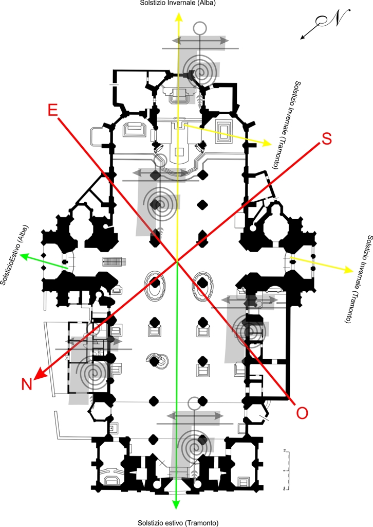 Intanto concentriamoci sulla sua orientazione astronomica, invariata fin dal primo edificio cristiano qui eretto. L’abside, da sempre, punta al Solstizio invernale e precisamente all’alba del 26 Dicembre 1137, data di fondazione della prima chiesa e giorno di Santo Stefano, patrono della cattedrale. Il Solstizio invernale è il momento in cui “i cieli si aprono”, comincia un nuovo ciclo. Questo fu proprio ciò che, secondo tradizione, contemplò il protomartire Stefano morendo: “vide i cieli che si aprivano”. Ma anche il portale maggiore del duomo è orientato con buona approssimazione ad un Solstizio, quello estivo ed esattamente al tramontare del sole in quei giorni. Dunque la cattedrale giace su un particolare asse che collega, a queste latitudini, l’alba del Solstizio invernale con il tramonto del Solstizio estivo, l’alba di un solstizio e il tramonto del successivo, come a racchiudere in sé l’intera durata di un ciclo cosmico. I due fenomeni corrispondenti, alba del Solstizio estivo e tramonto del Solstizio invernale possono essere facilmente “traguardati” dagli ingressi delle due torri campanarie.