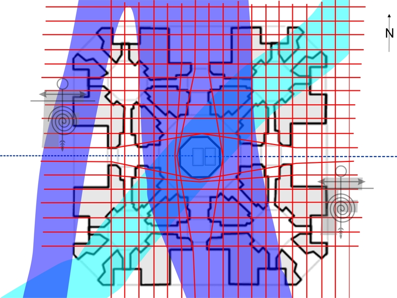 L’ultima caratteristica rintracciabile attravrso l’analisi radioestesica รจ la peculiare disposizione della rete geomagnetica Hartmann intorno al Taj e al suo interno. La rete infatti, ben disposta e uniforme nel complesso, si spinge senza ostacoli apparenti anche dentro i suoi muri e nelle sue stanze. Ma risulta deviata intorno al nucleo centrale, come se quell’ottagono scavato nel pavimento (la stanza sotterranea, non il diaframma costruito al piano di calpestio) riuscisse in qualche modo a “difendere” dalla rete ciรฒ che contiene.